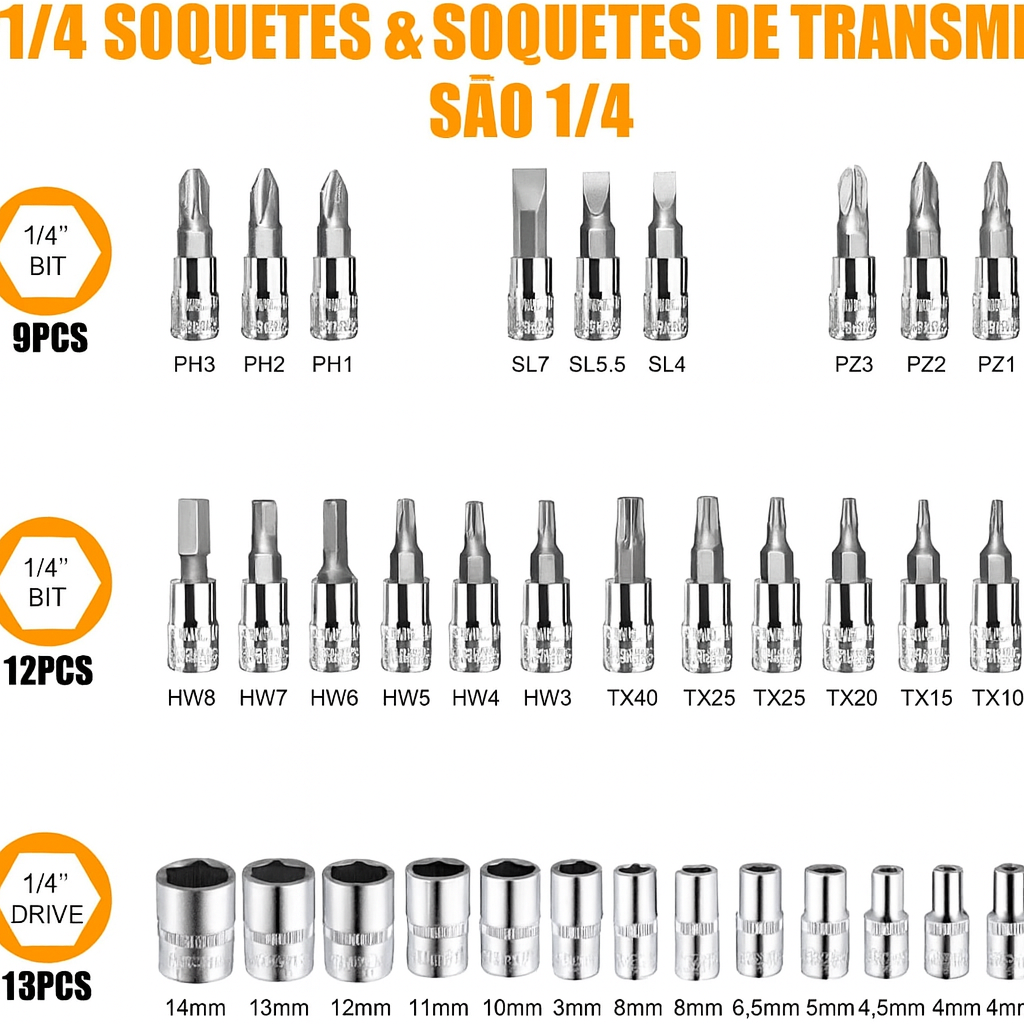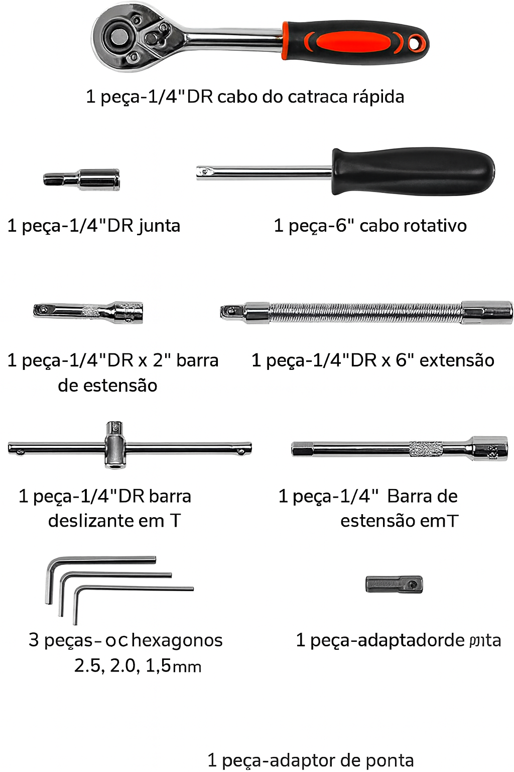 Com este kit de soquetes, você terá em mãos uma variedade de ferramentas essenciais para realizar reparos e ajustes com eficiência e precisão. Seja para uso doméstico ou profissional, este conjunto é um must-have para qualquer pessoa que precise de uma caixa de ferramentas completa e prática.