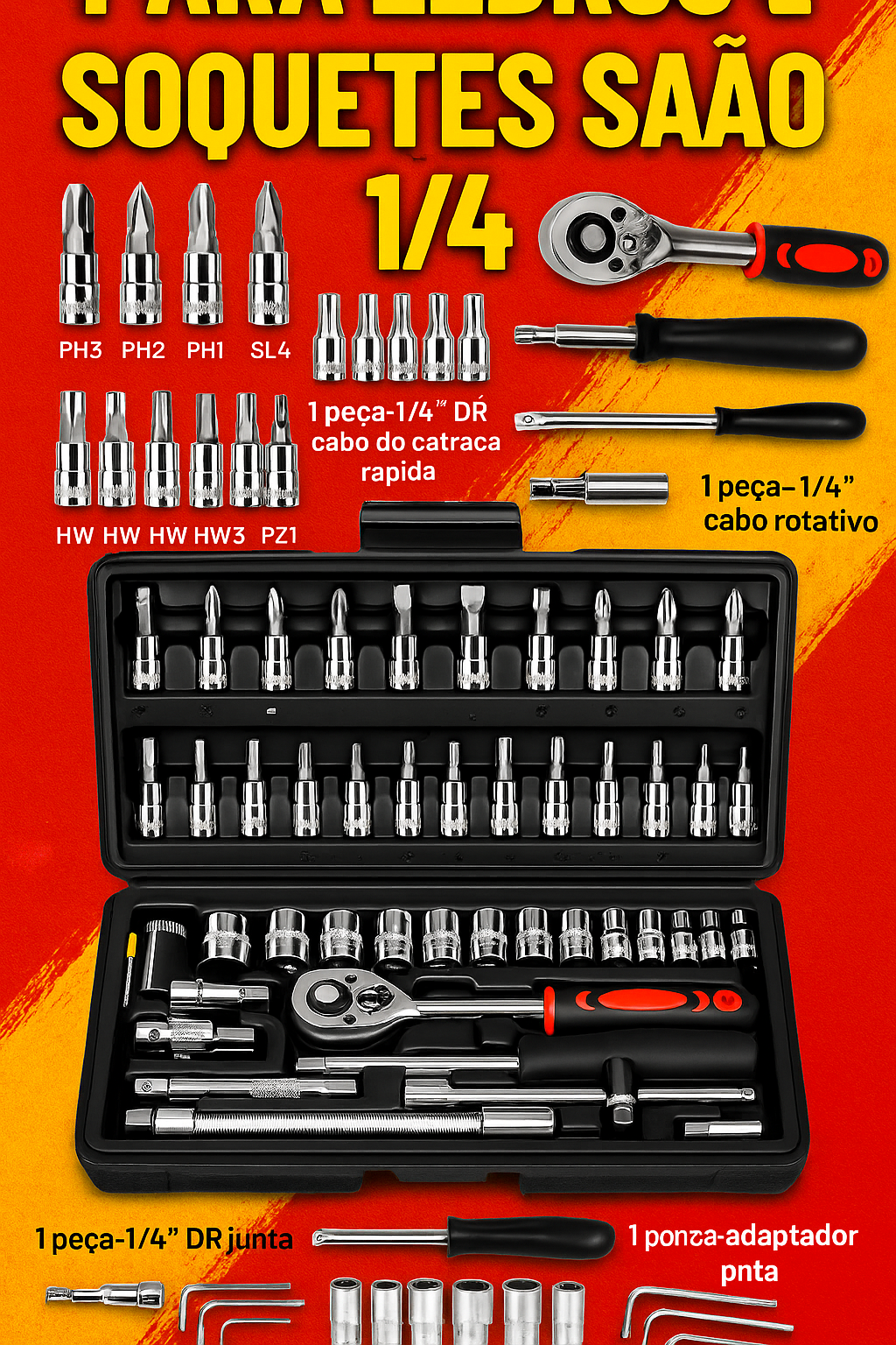O Kit de Soquetes 1/4" 46 Peças com Mala é um conjunto completo para realizar diversos trabalhos de manutenção em casa, moto e carro. Com soquetes de diferentes tamanhos e acessórios adicionais, você terá todas as ferramentas necessárias em um único kit.