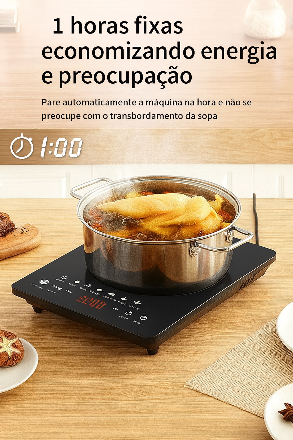 🕒 Temporizador de até 1 hora – programa o tempo, a máquina desliga sozinha e você não se preocupa com a sopa a transbordar.