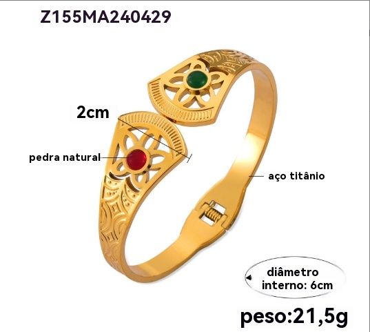 🔗 Design: Pulseira de punho aberto — ajustável, adaptável a diferentes tamanhos de pulso.⚖️ Peso total: Aproximadamente 12g — leve e confortável, sem sensação de peso ao usar.📐 Dimensões das pedras: Pedras vermelhas (≈4mm x 6mm cada), pedras verdes (≈3mm x 5mm cada) — tamanho harmonioso, embebidas firmemente no corpo.📏 Espessura da placagem de ouro: ≈0.3μm — camada resistente, mantendo o brilho dorado por longo tempo.🌟 Tratamento de superfície: Polimento de alto brilho — toque suave e liso, sem rebates.🎨 Cor predominante: Dourado com detalhes de pedras vermelhas e verdes — combinação elegante, adequada para diversos estilos.🛡️ Resistência: À água doce (chuva, lavagem de mãos) — não danifica o material, mas evite contato com produtos químicos (perfumes, cremes).